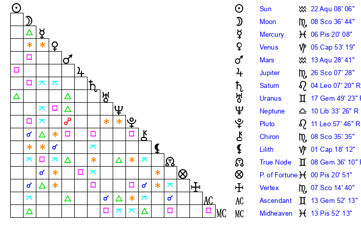 | Pluto | 11 Leo 57 | 2 Aquarius 23 | 10 Leo 59 |