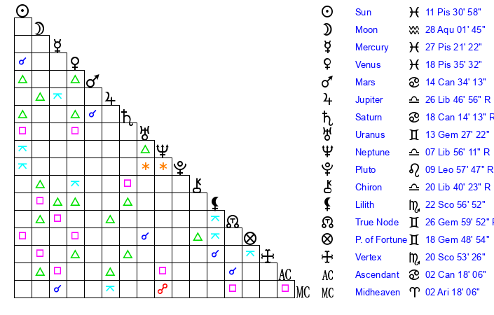 | Mercury | 27 Pisces 22 | 29 Pisces 0 | 16 Taurus 38 |