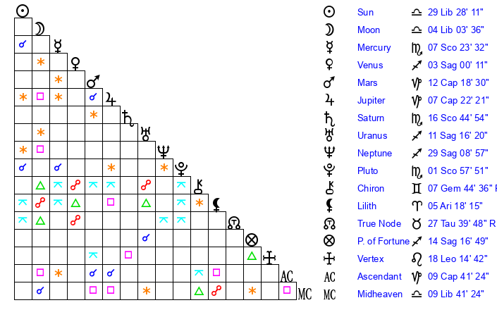 | Pluto | 1 Scorpio 57 | 1 Aquarius 22 | 3 Scorpio 32 |