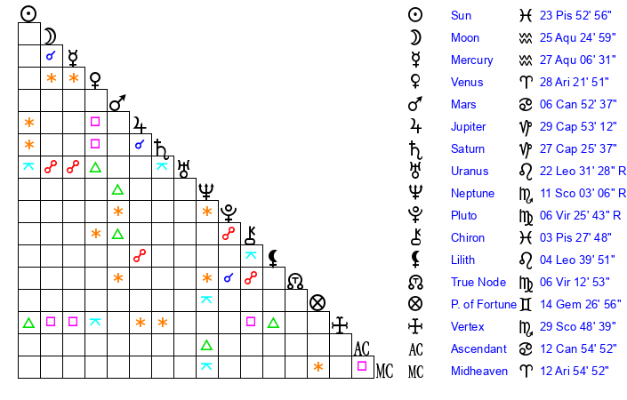 | Moon | 25 Aquarius 34 | 28 Virgo 52 | 1 Cancer 53 |