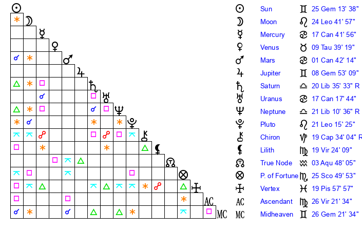 | Sun | 25 Gemini 13 | 25 Gemini 48 | 4 Virgo 6 |
