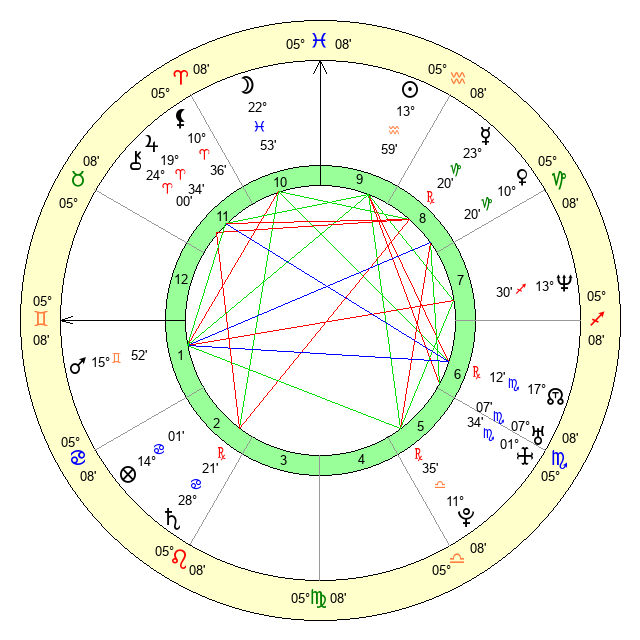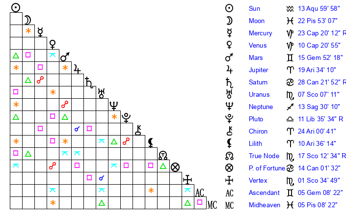 | Sun | 14 Aquarius 0 | 15 Aquarius 7 | 3 Aries 11 |