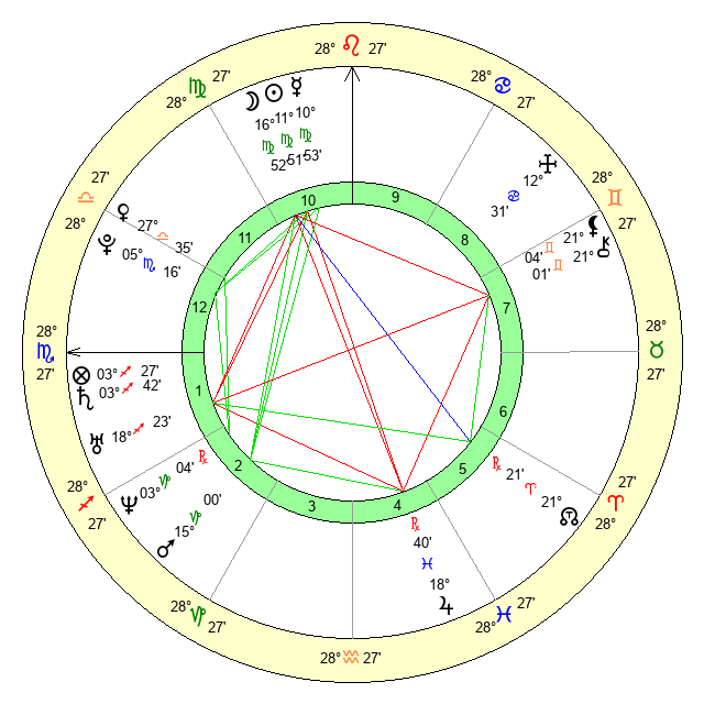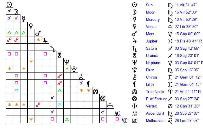 | Moon | 16 Virgo 56 | 3 Aquarius 31 | 0 Pisces 28 |
