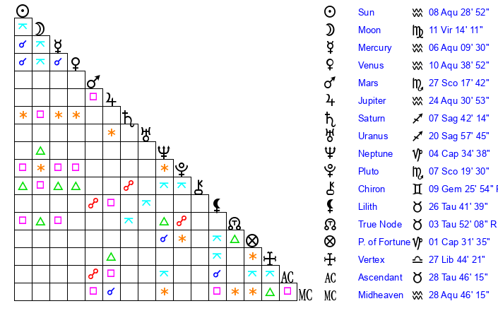 | Moon | 11 Virgo 12 | 28 Capricorn 29 | 24 Aquarius 29 |