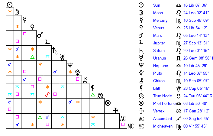 | Mars | 5 Leo 14 | 12 Scorpio 14 | 6 Virgo 41 |
