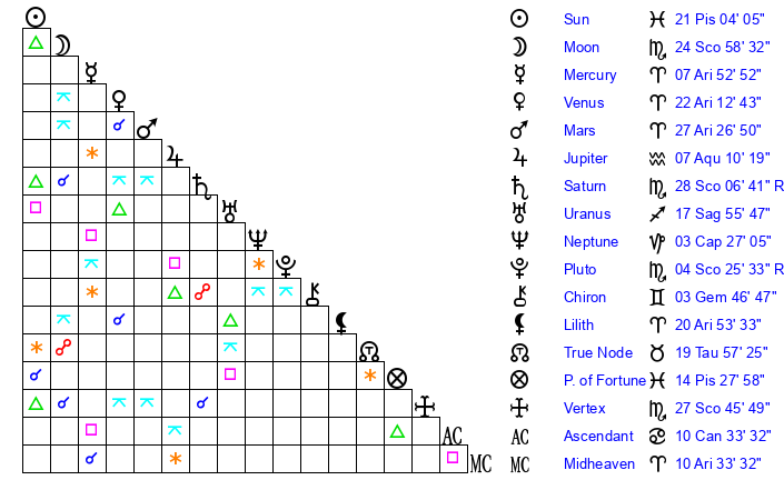 | Saturn | 28 Scorpio 24 | 21 Pisces 56 | 26 Scorpio 55 |