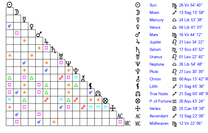 | Sun | 28 Virgo 54 | 29 Virgo 56 | 8 Sagittarius 43 |