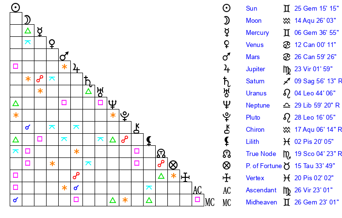 | Moon | 14 Aquarius 24 | 29 Aquarius 19 | 5 Leo 0 |
