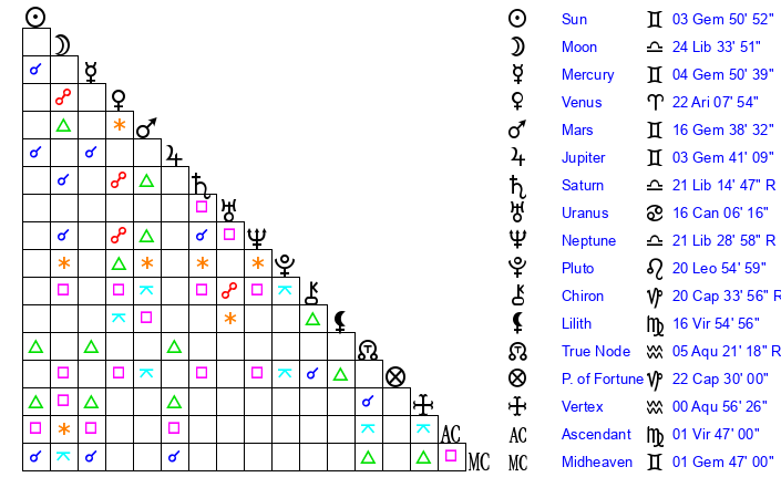 Sun | 3 Gemini 51 | 4 Gemini 25 | 12 Leo 38 |