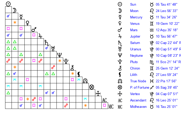 | Moon | 24 Leo 55 | 6 Aries 0 | 27 Sagittarius 40 |