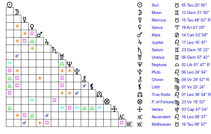 | Sun | 5 Taurus 21 | 5 Taurus 44 | 23 Cancer 3 |