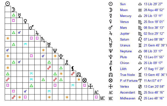 | Sun | 13 Libra 29 | 14 Libra 21 | 2 Capricorn 58 |