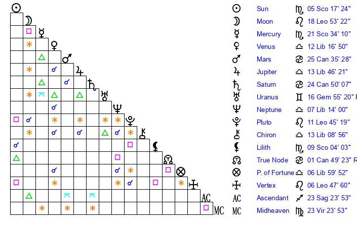 | Sun | 5 Scorpio 17 | 5 Scorpio 54 | 26 Capricorn 22 |