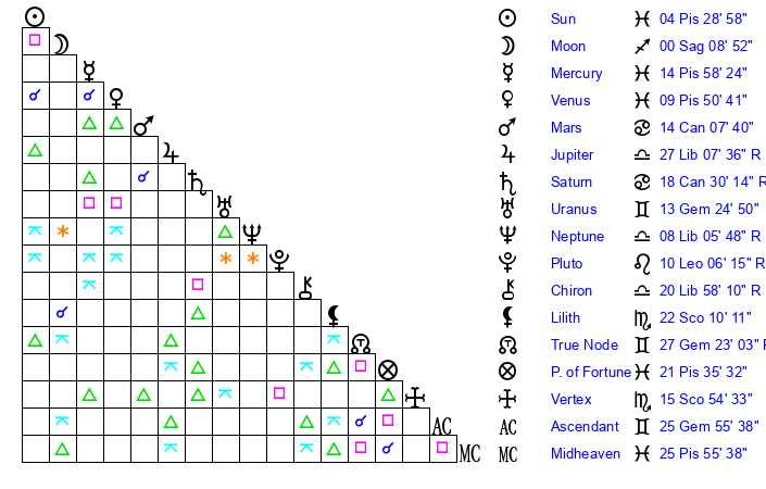 | Mercury | 14 Pisces 59 | 17 Pisces 2 | 3 Taurus 36 |