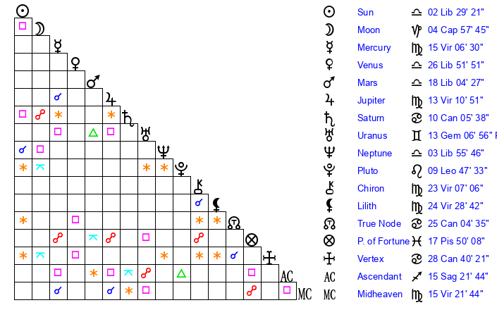 | Neptune | 3 Libra 57 | 0 Aries 41 | 6 Libra 18 |
