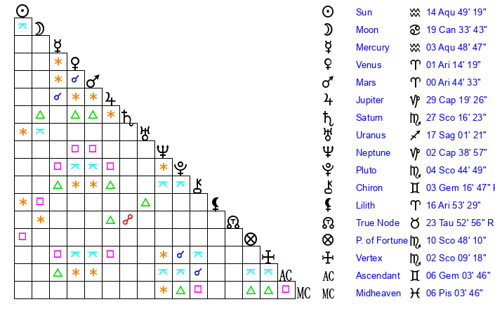| Sun | 14 Aquarius 49 | 15 Aquarius 7 | 25 Pisces 3 |