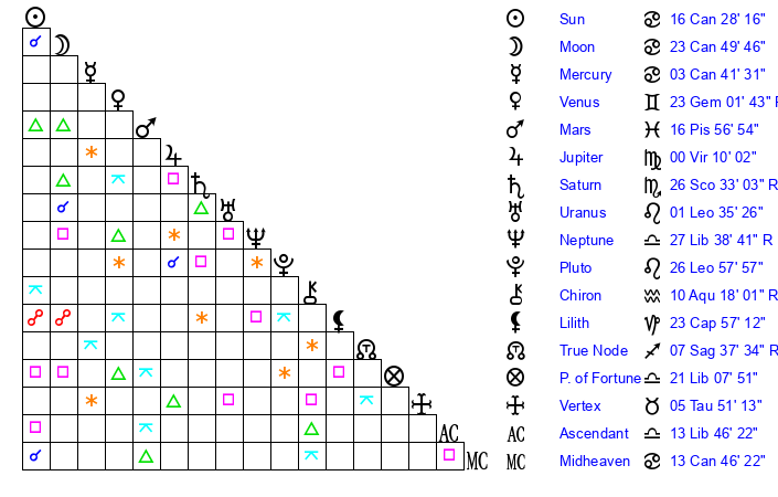 | Moon | 23 Cancer 50 | 21 Sagittarius 46 | 3 Aquarius 16 |