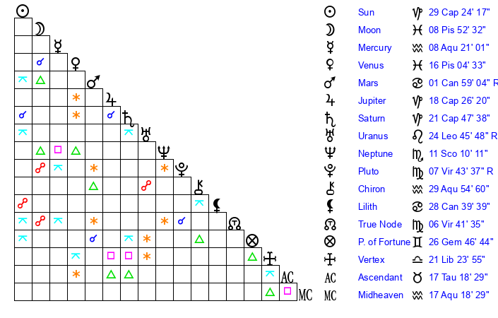 | Jupiter | 18 Capricorn 19 | 11 Gemini 41 | 1 Aquarius 29 |