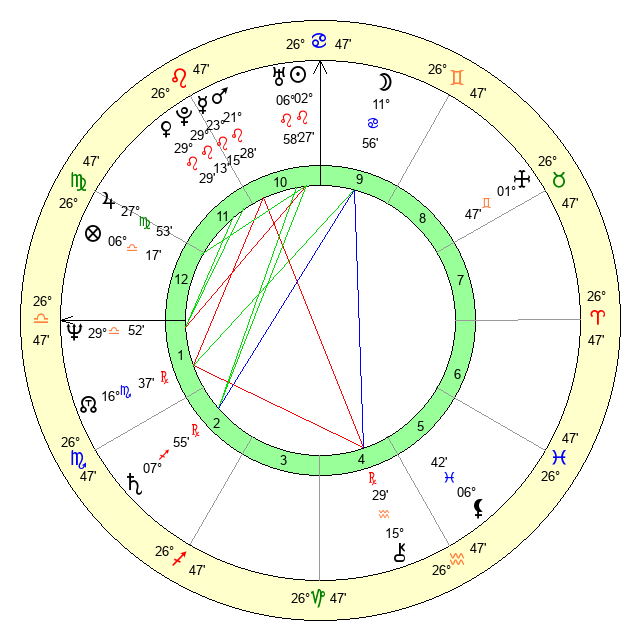 | Moon | 11 Cancer 55 | 14 Leo 26 | 19 Capricorn 25 |