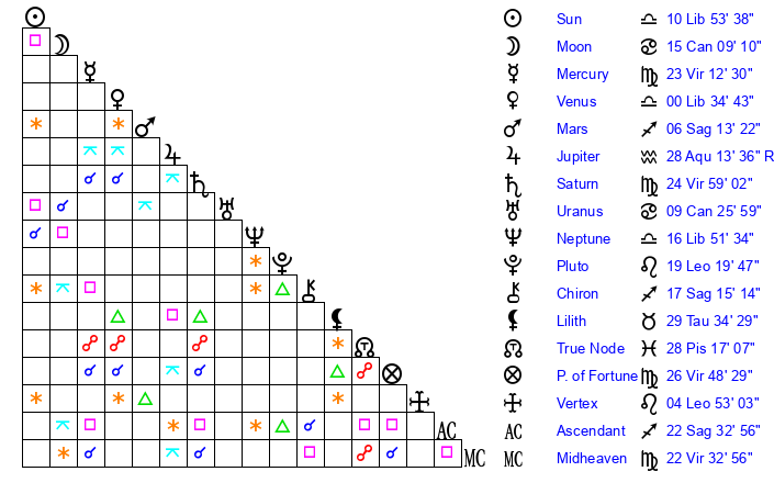 | Mercury | 23 Virgo 12 | 26 Libra 58 | 16 Capricorn 13 |