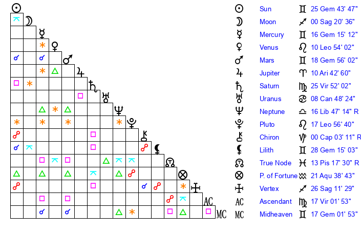 Sun | 25 Gemini 43 | 26 Gemini 47 | 6 Virgo 33 |
