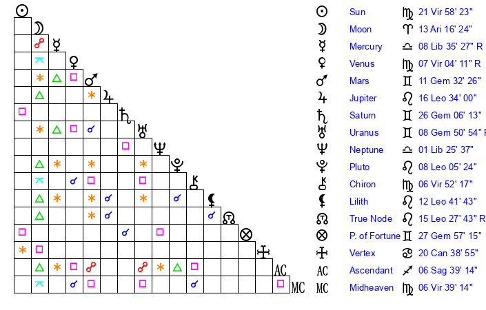 | Sun | 21 Virgo 58 | 23 Virgo 6 | 13 Sagittarius 42 |