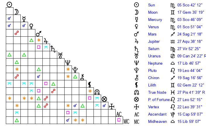 | Sun | 5 Scorpio 42 | 6 Scorpio 31 | 21 Capricorn 41 |