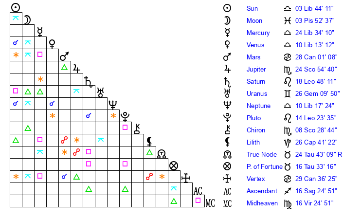 | Moon | 3 Pisces 55 | 9 Sagittarius 37 | 15 Capricorn 56 |