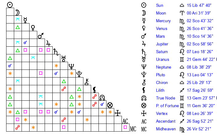 | Neptune | 8 Libra 39 | 0 Aries 18 | 10 Libra 44 |
