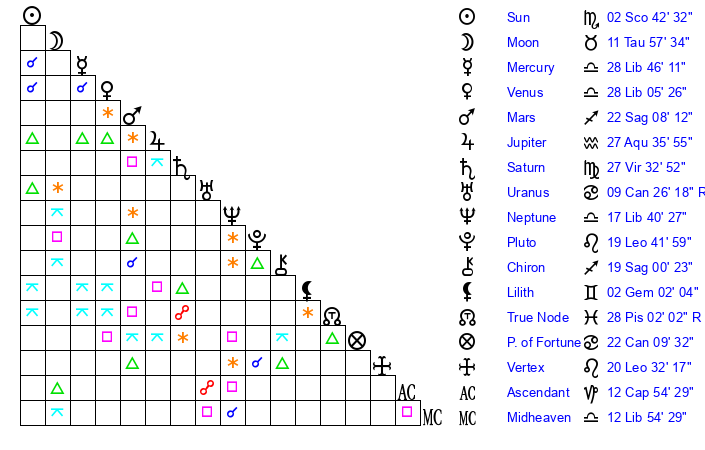 | Neptune | 17 Libra 40 | 29 Pisces 53 | 19 Libra 29 |