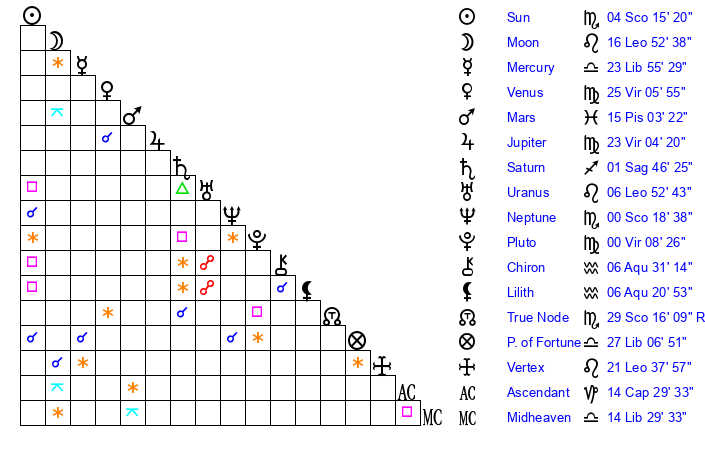 | Neptune | 0 Scorpio 19 | 29 Pisces 52 | 2 Scorpio 21 |