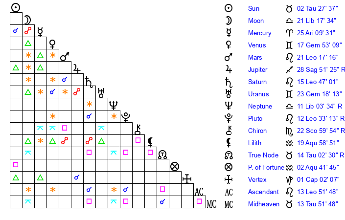 | Saturn | 16 Leo 16 | 26 Pisces 53 | 21 Leo 30 |