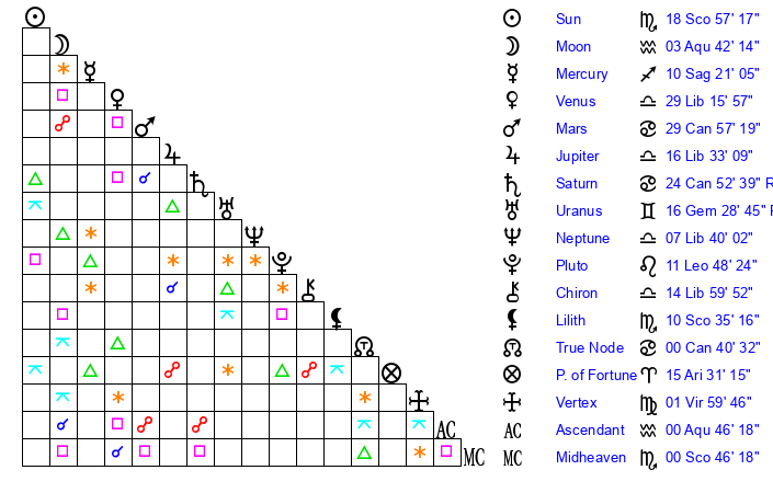 | Sun | 18 Scorpio 57 | 19 Scorpio 33 | 10 Aquarius 13 |