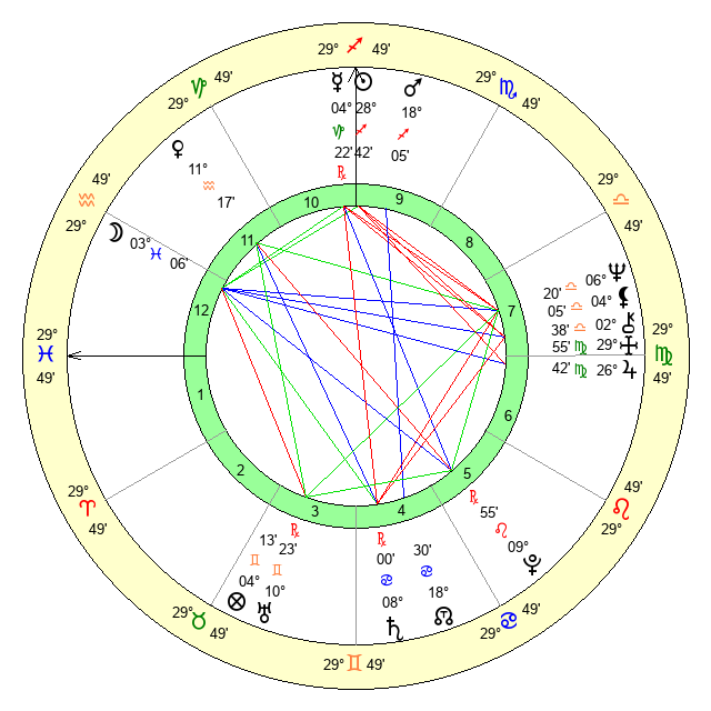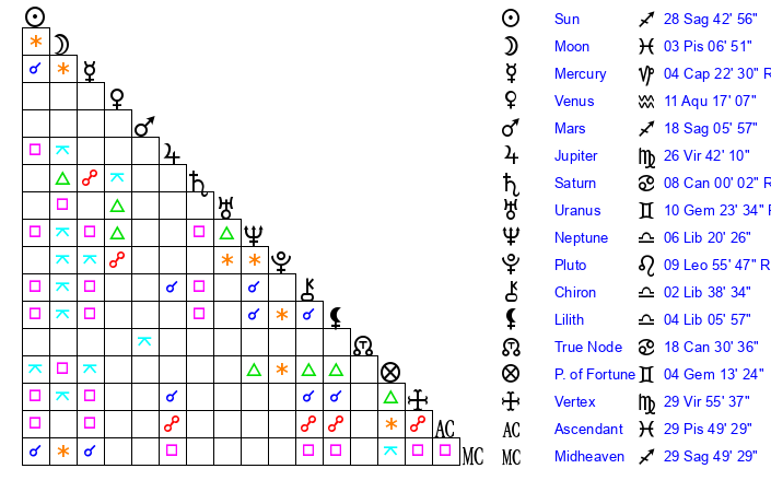 | Neptune | 6 Libra 21 | 29 Pisces 23 | 5 Libra 28 |