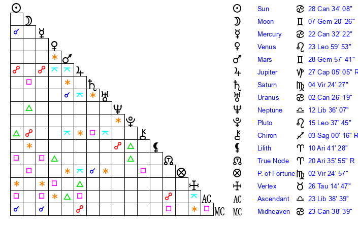 | Sun | 28 Cancer 34 | 29 Cancer 11 | 12 Libra 7 |
