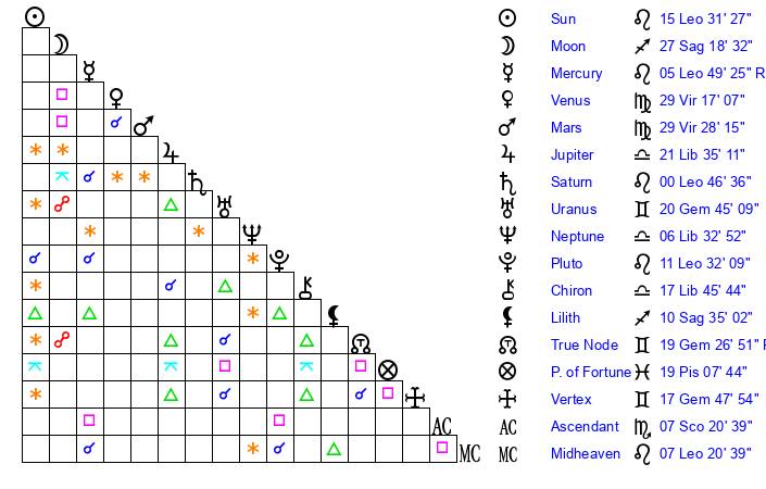 | Sun | 15 Leo 32 | 16 Leo 24 | 2 Scorpio 41 |