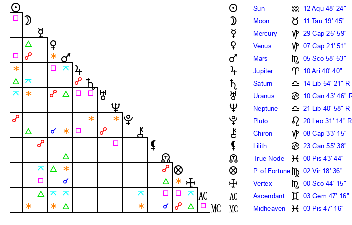 | Sun | 12 Aquarius 48 | 14 Aquarius 6 | 25 Aries 39 |