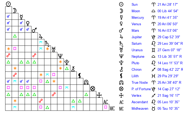 | Sun | 21 Aries 28 | 22 Aries 3 | 4 Cancer 44 |