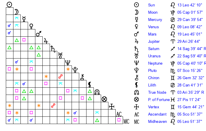 | Neptune | 5 Capricorn 39 | 1 Aries 53 | 5 Capricorn 13 |