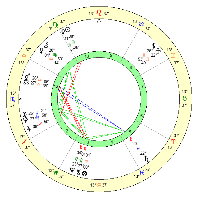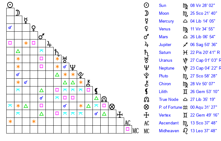 | Sun | 8 Virgo 28 | 9 Virgo 11 | 7 Libra 43 |