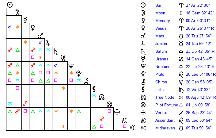 | Moon | 18 Gemini 36 | 19 Sagittarius 7 | 27 Capricorn 7 |