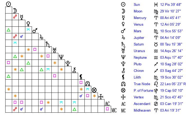 | Sun | 12 Pisces 40 | 13 Pisces 22 | 8 Aries 34 |