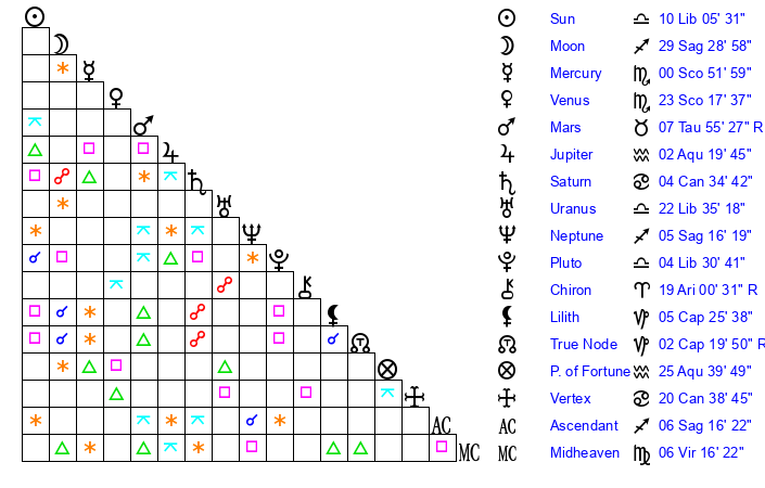| Moon | 29 Sagittarius 36 | 21 Aquarius 25 | 27 Scorpio 46 |