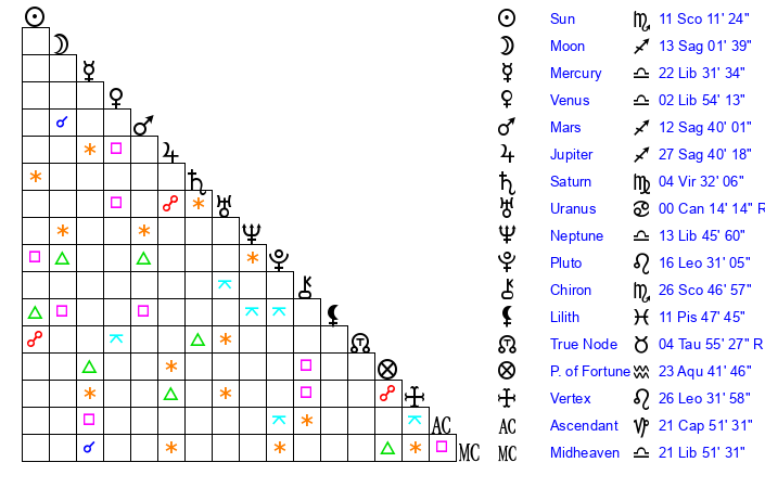 | Sun | 11 Scorpio 11 | 11 Scorpio 31 | 29 Capricorn 19 |