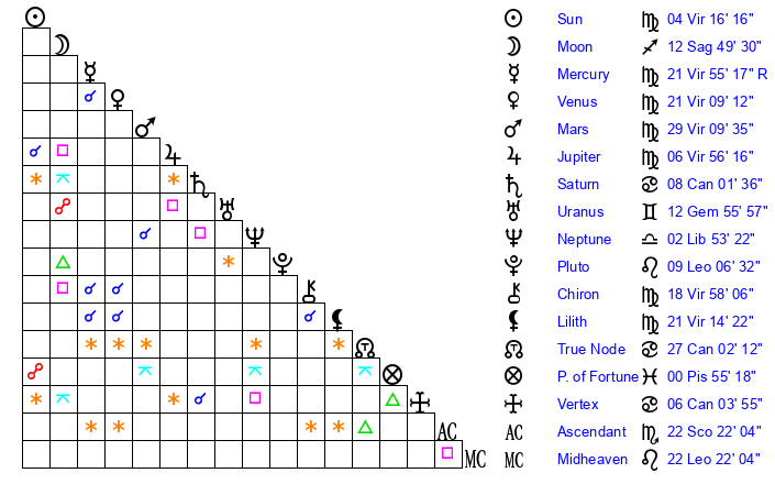 | Sun | 4 Virgo 16 | 4 Virgo 40 | 24 Scorpio 14 |