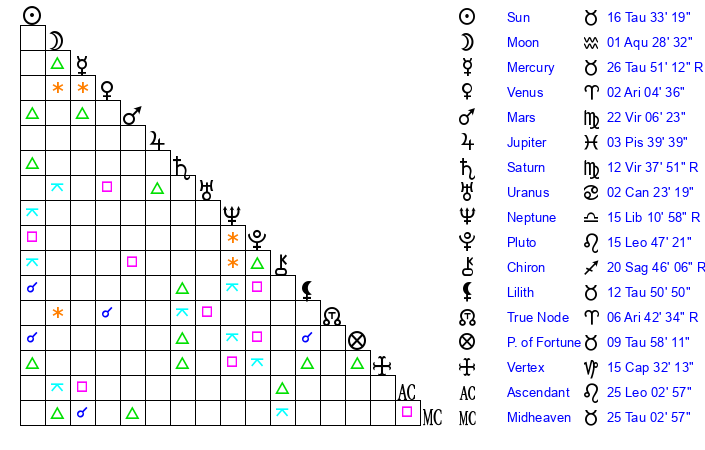 | Saturn | 13 Virgo 10 | 28 Pisces 25 | 16 Virgo 39 |