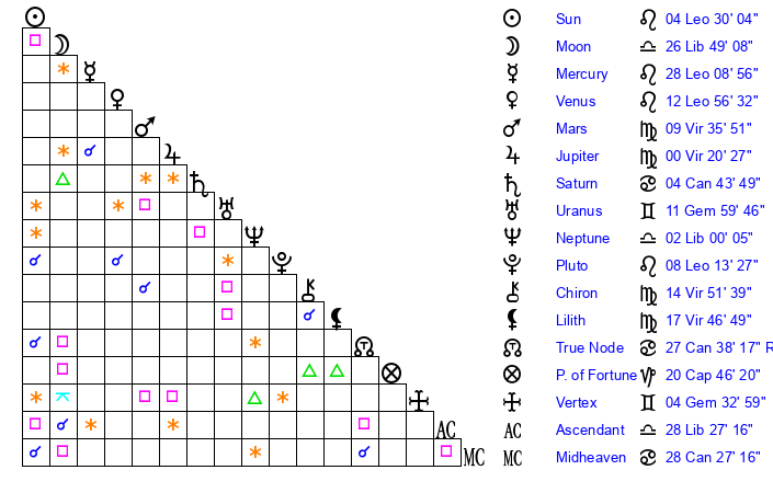 | Venus | 12 Leo 57 | 26 Gemini 1 | 22 Scorpio 39 |