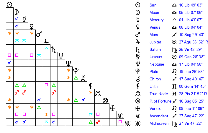 | Saturn | 26 Virgo 11 | 26 Pisces 56 | 2 Libra 34 |