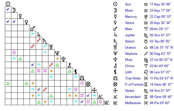 | Sun | 17 Aquarius 30 | 18 Aquarius 9 | 12 Aries 32 |