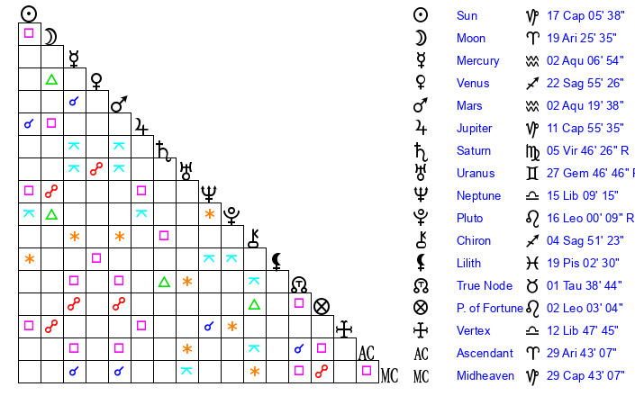 | Moon | 19 Aries 25 | 13 Virgo 17 | 22 Aquarius 2 |